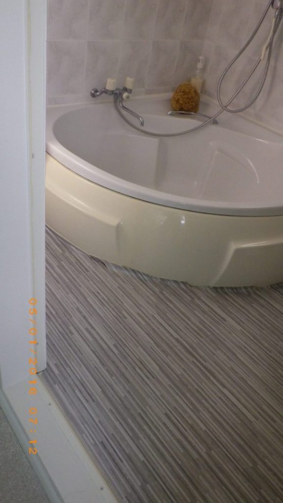 風呂桶の微妙なカーブに合わせながら、床張り。塗装面をタイル側に向け少しでもカビ対策。