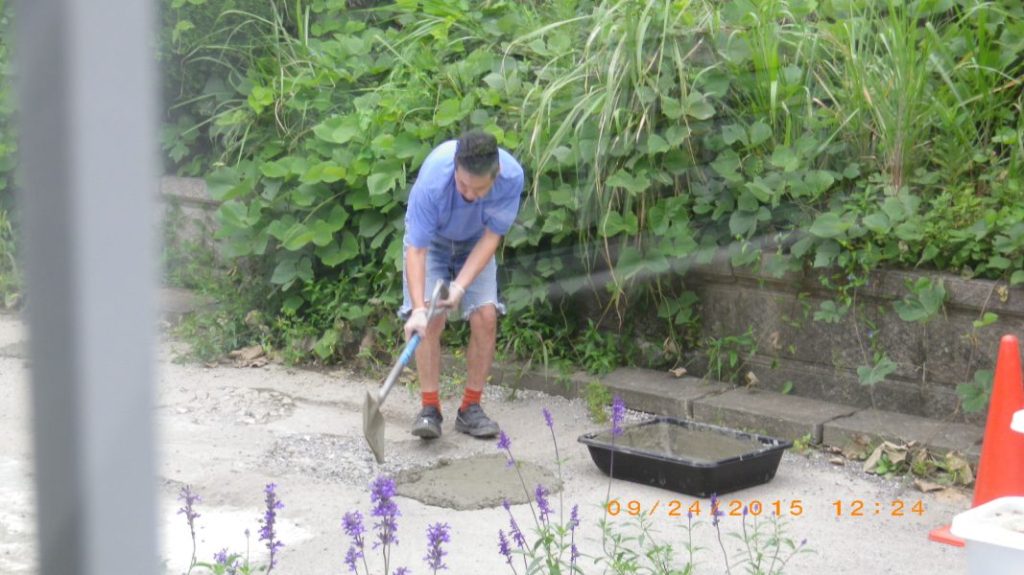 そこで、余った(余計に作った)モルタルに、砂利を二袋足し道の補修。
