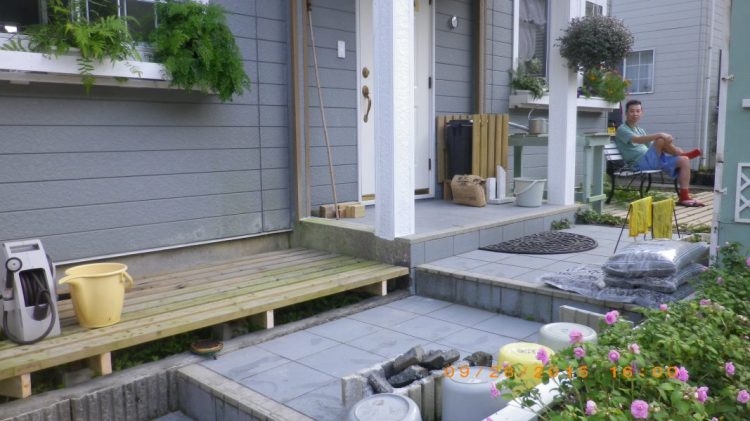 小さなデッキは玄関の前と位置を合わせ張り替えてやれやれ。