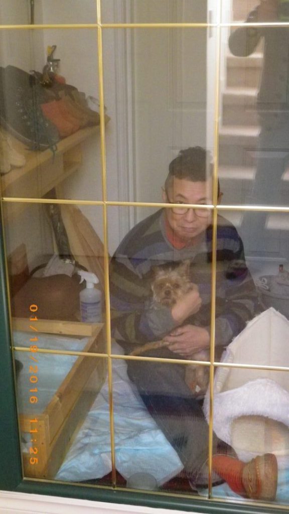 久しぶりに人に掴まれ、ビックリしたのか、安心したのか、吠えもせず固まっている。