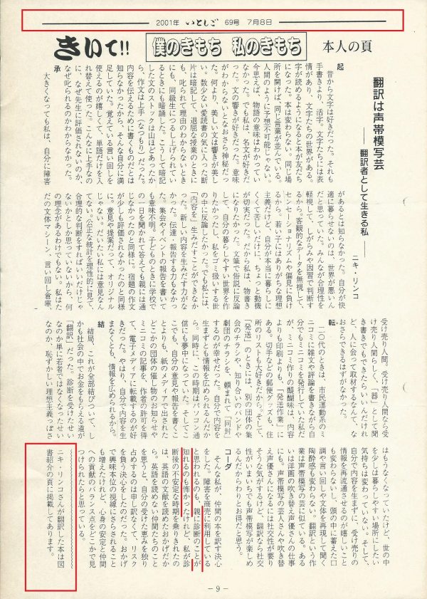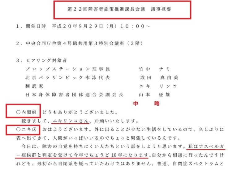 日本自閉症協会(現:東京都自閉症協会)では、診断を受けていないニキリンコは診断済み当事者として扱われ書籍の宣伝までしてくれます。