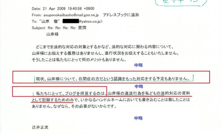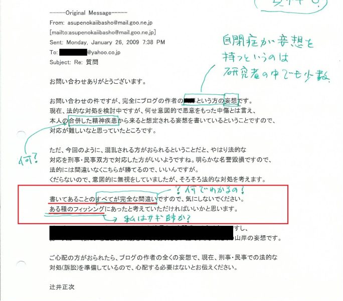 アスペエルデの会CEOの辻井正次氏より中傷はよそで書け言われました。