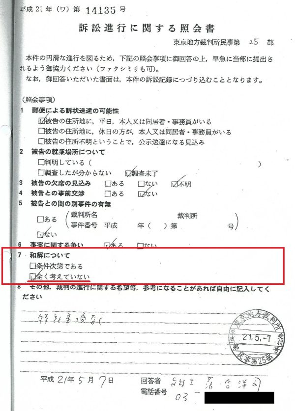 その態度は一貫し、裁判前からコチラからの示談交渉すら一切受け付けないとの態度です。
